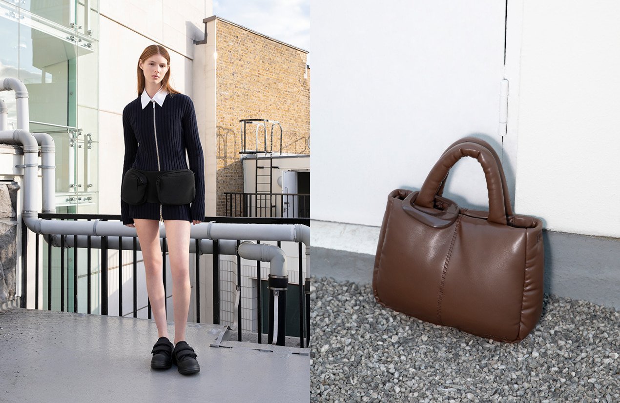 Play with proportions and create visual interest with plush padded bags and shoes. Balance a streamlined winter look with the chunky contours of the nylon padded double-strap slip-on sneakers — these shoes stand out with their youthful aesthetic and futuristic edge. Or, soften a tailored all-black look with the Moore padded tote bag in luxurious dark brown .