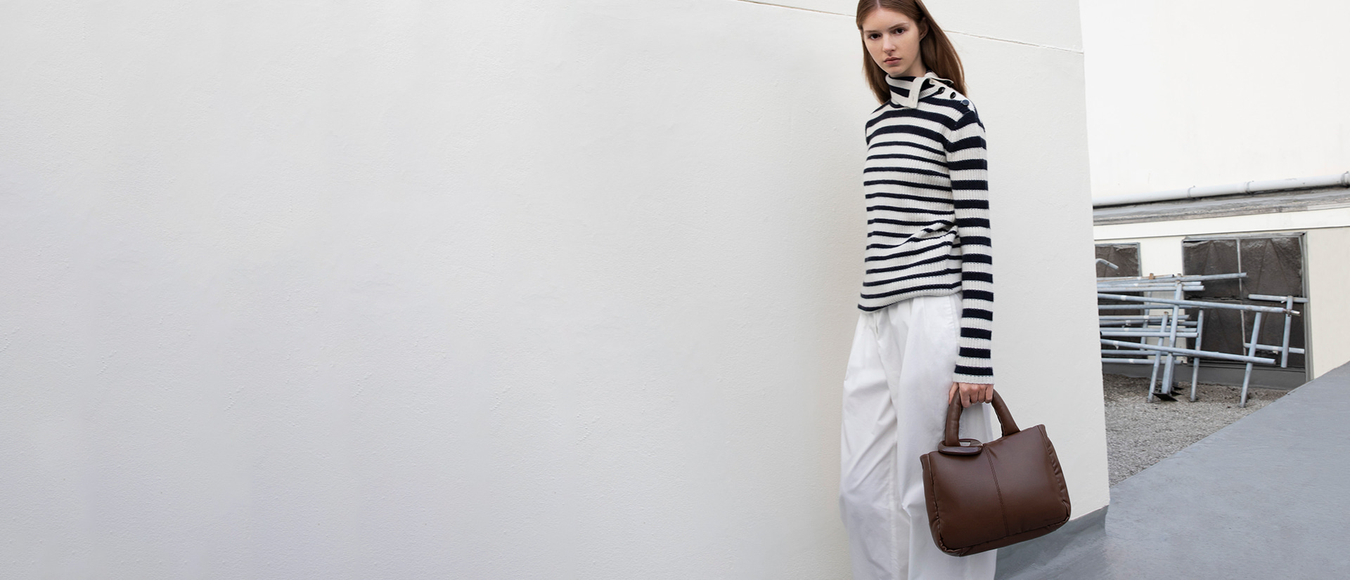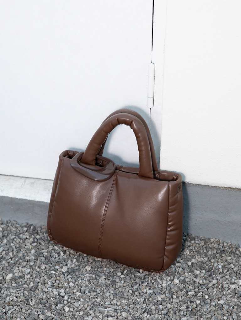 Play with proportions and create visual interest with plush padded bags and shoes. Balance a streamlined winter look with the chunky contours of the nylon padded double-strap slip-on sneakers — these shoes stand out with their youthful aesthetic and futuristic edge. Or, soften a tailored all-black look with the Moore padded tote bag in luxurious dark brown .