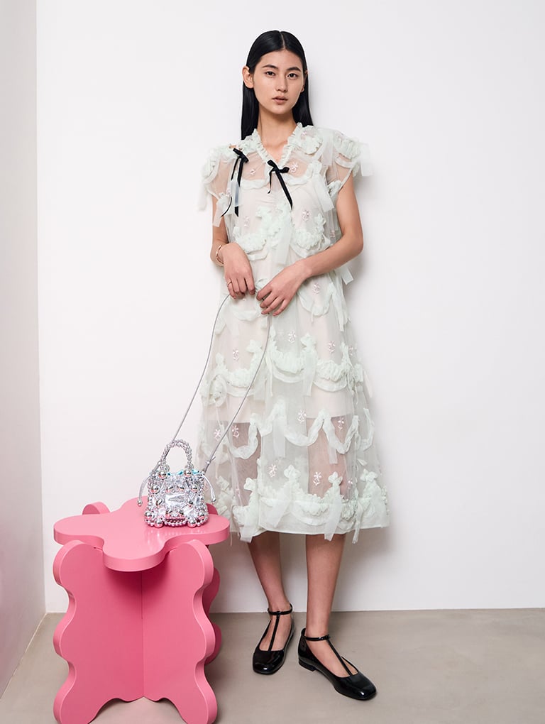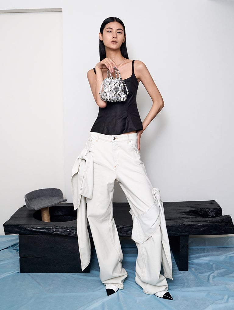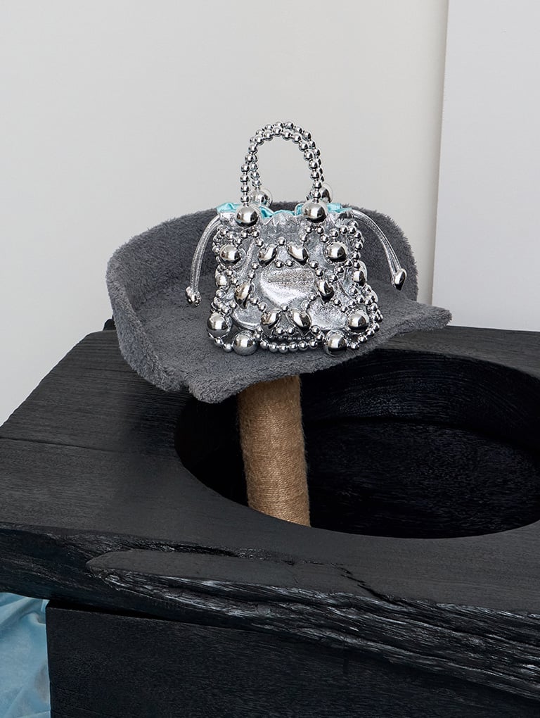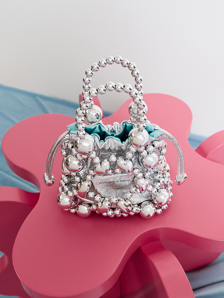 The gift set includes a silver beaded top-handle bag, adorned with a mix of charming heart-shaped beads. The high-shine finish of this chrome-coated bag exudes glamour and will appeal to those with a keen sense of style. It perfectly complements the classic pink and red colour palette of Qixi, adding a bold, futuristic touch that seamlessly merges traditional and modern elements.